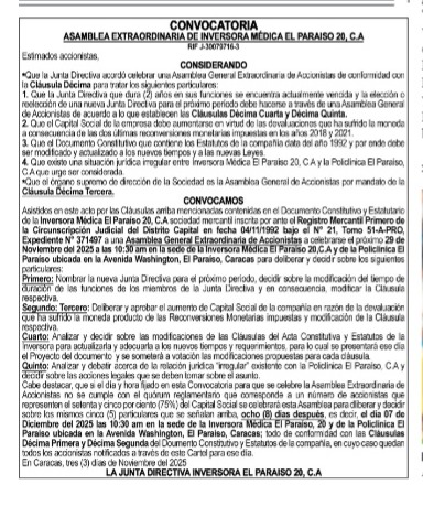 Cabe destacar, que si el día y hora fijado en esta Convocatoria para que se celebre la Asamblea Extraordinaria de Accionistas no se cumple con el quórum reglamentario que corresponde a un número de accionistas que representen el setenta y cinco por ciento (75%) del Capital Social, se celebrará esta Asamblea para deliberar y decidir sobre los mismos cinco (5) particulares que se señalan arriba, ocho (8) días después, es decir, el día 07 de Diciembre del 2025 las 10:30 am en la sede de la Inversora Médica El Paraíso 20 y de la Policlínica El Paraíso ubicada en la Avenida Washington, El Paraíso, Caracas; todo de conformidad con las Cláusulas Décima Primera y Décima Segunda del Documento Constitutivo y Estatutos de la compañía, en cuyo caso quedan todos los accionistas notificados a través de este Cartel para ese día.